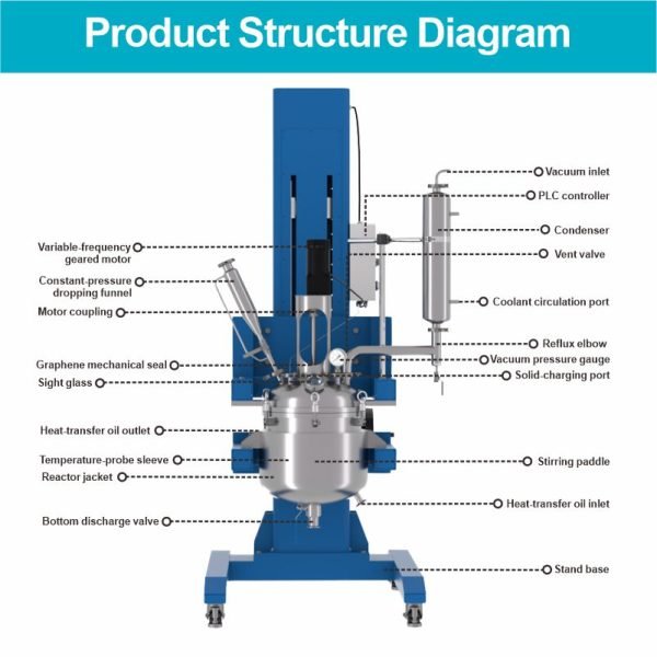 Advantages: 1. Intrinsically Safe Explosion-Proof Design: The core electrical components (such as motors and control boxes) adopt nationally certified explosion-proof designs, effectively isolating electrical sparks from flammable environments. It is specifically designed for handling chemical reactions involving flammable, explosive, or hazardous gases, ensuring the safety of experiments and production. 2. High-Quality Corrosion-Resistant Material: The main body is made of 304 or 316L stainless steel, possessing excellent corrosion resistance and capable of withstanding various acids, alkalis, and organic solvents, ensuring material purity and extending equipment lifespan. 3. Convenient Electric Lifting Operation: Integrated electric lifting mechanism allows for smooth and precise lifting and tilting of the reactor body. This greatly simplifies feeding, cleaning, discharging, and maintenance processes, reducing labor intensity, improving work efficiency, and avoiding the risks of manual operation. 4. Efficient Mixing and Mass Transfer: Equipped with variable frequency speed control drive and anchor-type agitator…