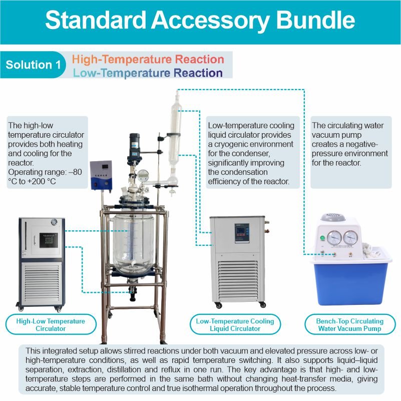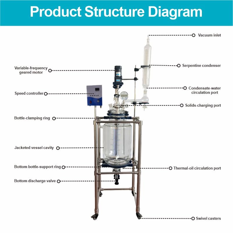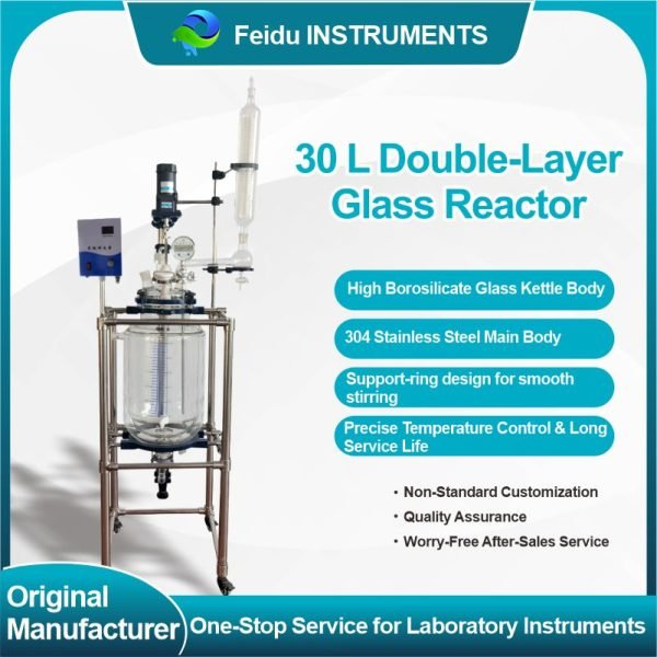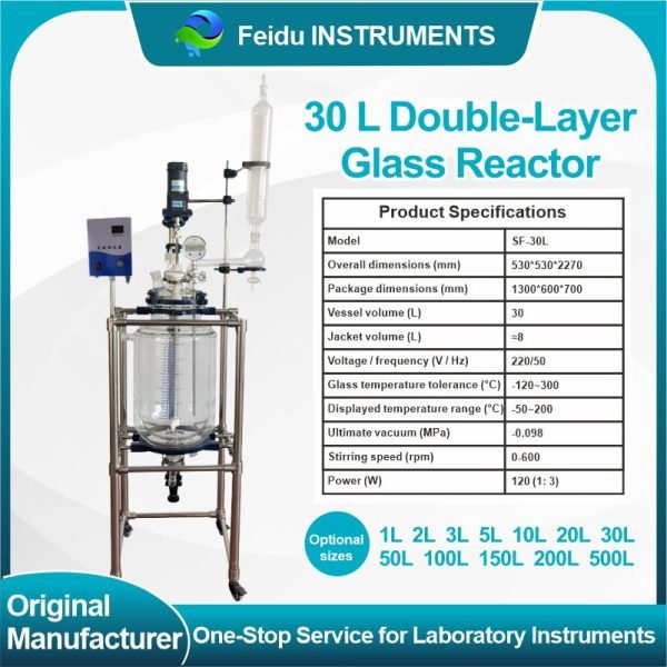 The double-walled glass reactor features a double-layered glass design. The inner layer contains the reaction solvent for stirring, while the outer layer can be circulated with different heat sources (refrigeration, hot water, or hot oil) for heating or cooling. Under set constant temperature conditions, stirring reactions can be carried out in the sealed glass reactor at atmospheric or negative pressure, depending on the application requirements. It also allows for reflux and distillation of the reaction solution, making it an ideal pilot-scale and production equipment for modern fine chemical plants, biopharmaceuticals, and the synthesis of new materials.